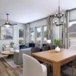 The heart of the home features an open living room, with easy access to the dining area and gourmet kitchen. The kitchen is a chef’s dream, complete with sleek countertops, ample cabinetry, stainless steel appliances – perfect for preparing meals or casual dining.