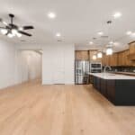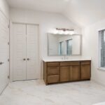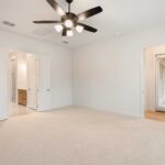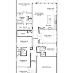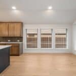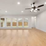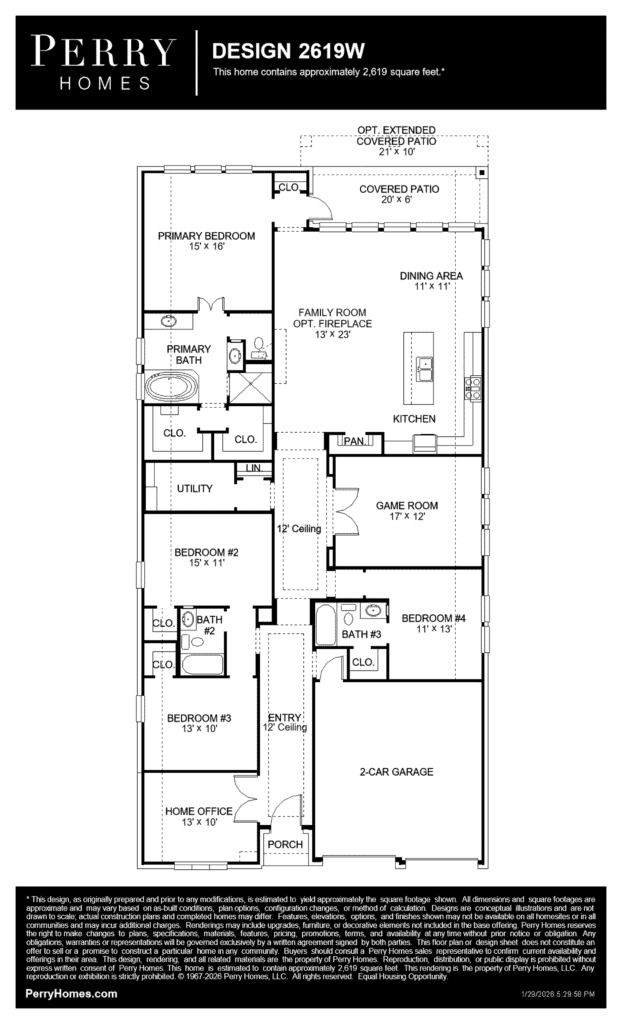 Welcoming front porch opens into an extended entryway adorned with 12-foot ceilings. French doors open into the private home office, located just off the entrance. Down the hallway, you will find the secondary bedrooms, each featuring walk-in closets and a shared full bathroom. Adjacent to the hallway, French doors open into the inviting game room, complete with three large windows. The open family room, featuring a wall of windows and a wood mantel fireplace, seamlessly leads into the designated dining area. The corner kitchen boasts an inviting island with built-in seating and a walk-in pantry. Entering the primary bedroom, you are greeted with ample natural light from the three large windows. French doors lead into the primary suite, showcasing dual vanities, a freestanding tub, a glass enclosed shower, and two walk-in closets. A guest suite with a walk-in closet and private full bathroom is located off the main hallway. The utility room with an included linen closet is conveniently located adjacent to the game room. Outside includes an extended covered backyard patio. Completing the home is a two-car garage. Representative Images. Features and specifications may vary by community.