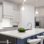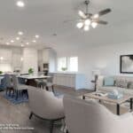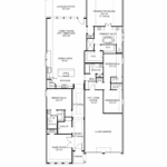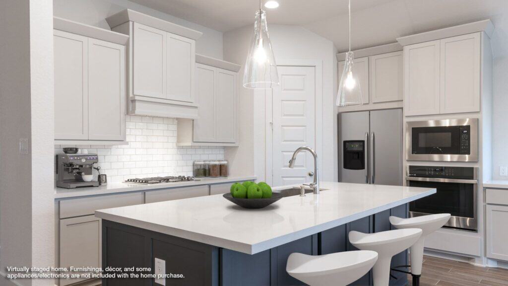 Entry with 13-foot ceilings framed by game room with French doors. Extended entry flows to the kitchen and dining area. Island kitchen with built-in seating space, a 5-burner gas cooktop, 2 wall ovens, and a corner walk-in pantry. Family room with a wall of windows and a wood mantel fireplace. Secluded primary suite. Primary bath offers dual vanities, a freestanding tub, separate glass enclosed shower and two walk-in closets. Guest suite with a full bathroom and a walk-in closet. Secondary bedrooms and a utility room complete this one-story design. Covered backyard patio. Mud room just off the three-car garage. Representative Images. Features and specifications may vary by community.