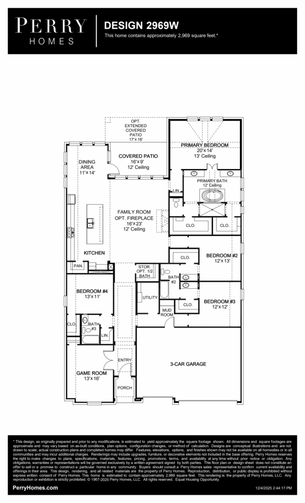 Welcoming entry extends past game room and utility room. Game room with French door entry. Spacious family room with a wood mantel fireplace and wall of windows. Island kitchen with built-in seating space, two wall ovens, a 5-burner gas cooktop and a walk-in pantry opens to the dining area with two walls of windows. Secluded primary suite features three large windows and 13-foot ceiling. French doors lead to primary bath with three windows, dual vanities, freestanding tub, separate glass enclosed shower, and two walk-in closets. Secondary bedrooms with walk-in closets and a Hollywood bathroom complete this design. Extended covered backyard patio. Mud room just off the three-car garage. Representative Images. Features and specifications may vary by community.