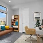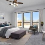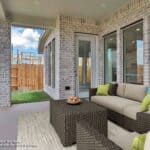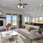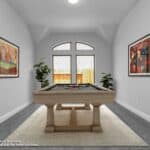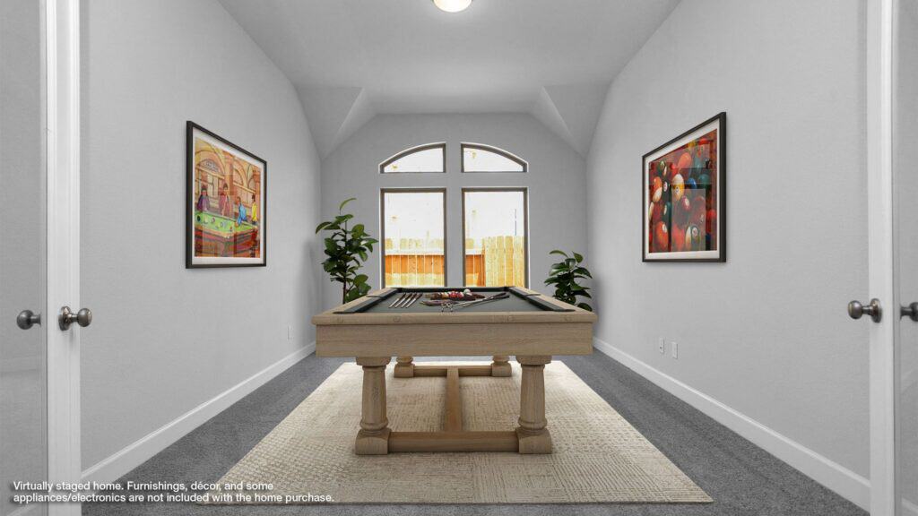 Home office with French doors is set at entry with 12-foot ceiling. Game room with French doors off the extended entry. Family room with a wood mantel fireplace and wall of windows opens to the kitchen and dining area. Kitchen features a 5-burner gas cooktop, a generous island with built-in seating space, and a walk-in pantry. Primary suite includes a bedroom with a wall of windows. Double doors lead to the primary bath with dual vanities, freestanding tub, separate glass-enclosed shower, and oversized walk-in closet. Guest suite with private bath adds to this four-bedroom design. Extended covered backyard patio. Two-car garage. Representative Images. Features and specifications may vary by community.