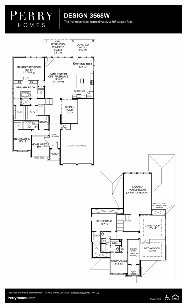 Home office with French doors frame the entry with 19-foot ceiling. Formal dining room flows into the family room and kitchen. Family room hosts a wall of windows, wood mantel fireplace and a 19-foot ceiling. Island kitchen with built-in seating space, two wall ovens, a 5-burner gas cooktop and a corner walk-in pantry flows into the morning area. Primary bedroom with a wall of windows. Primary bathroom hosts a French door entry, dual vanities, freestanding tub, separate glass enclosed shower and two walk-in closets that offer private access to the utility room. Additional bedroom with walk-in closet on first level. Second level hosts secondary bedrooms, a Hollywood bathroom, game room and a media room with French doors. Extended covered backyard patio. Mud room just off the three-car garage. Representative Images. Features and specifications may vary by community.