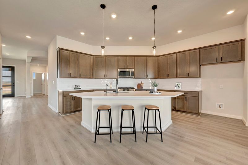The open floor plan seamlessly connects the living spaces, offering an expansive and airy atmosphere that is perfect for both relaxation and entertaining. At the heart of the home is a gourmet kitchen featuring a stunning diamond-shaped island that serves as the focal point. With sleek countertops, unique cabinetry and top-of-the-line stainless steel appliances, the kitchen offers both form and function. The large island provides ample seating, making it ideal for casual dining or hosting guests.