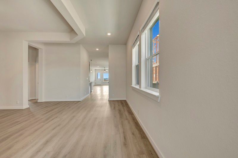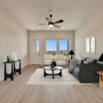 The open flow from the kitchen to the living and dining areas makes this home perfect for effortless entertaining. The bright and airy living room, enhanced by large windows, creates a welcoming space filled with natural light.